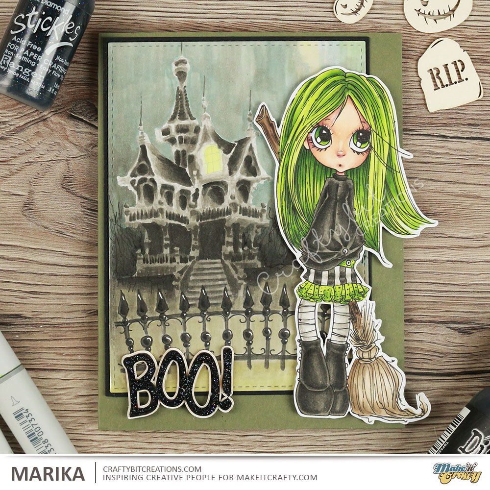 The last thing I did for this card was to crop the background and place it on the side, both to help me place Elphaba better (I think I printed her a little bigger than I should have). But also to make room for a sentiment. The sentiment is one of the wonderful chippies also from Make It Crafty, I’ve coloured the back piece white, and the smaller piece black, both with Distress Paint. Then I added stickles on top, to give it a little extra pop.