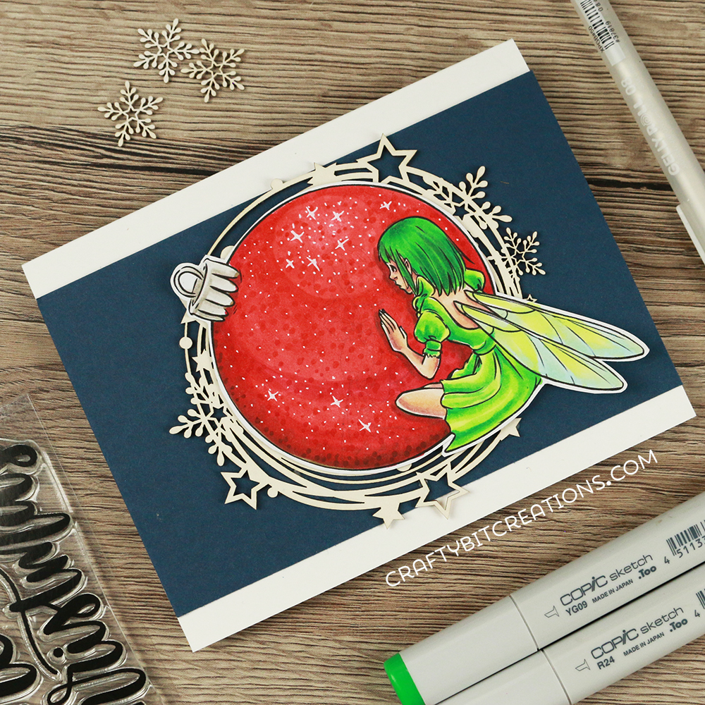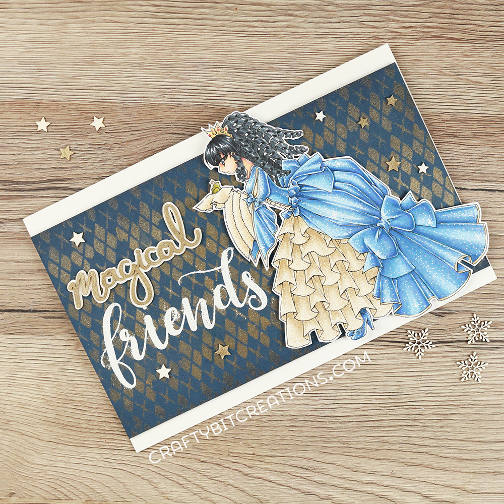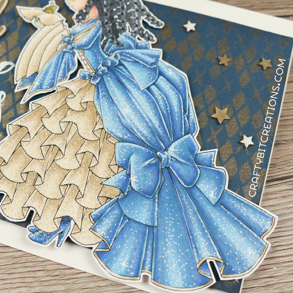 Todays card and videos (there is two) is all about those glittered effects, and gosh did I challenge myself with this one. I’ve tried colouring this image multiple times, never feeling that I make it justice, and then I added the challenge of glitter on top of that. It was super scary but also super satisfying! The glitter effect on the dress is created with metallic, glitter and white gel pens, you can see all how I coloured it below if you want to see it in HD you can do that HERE.