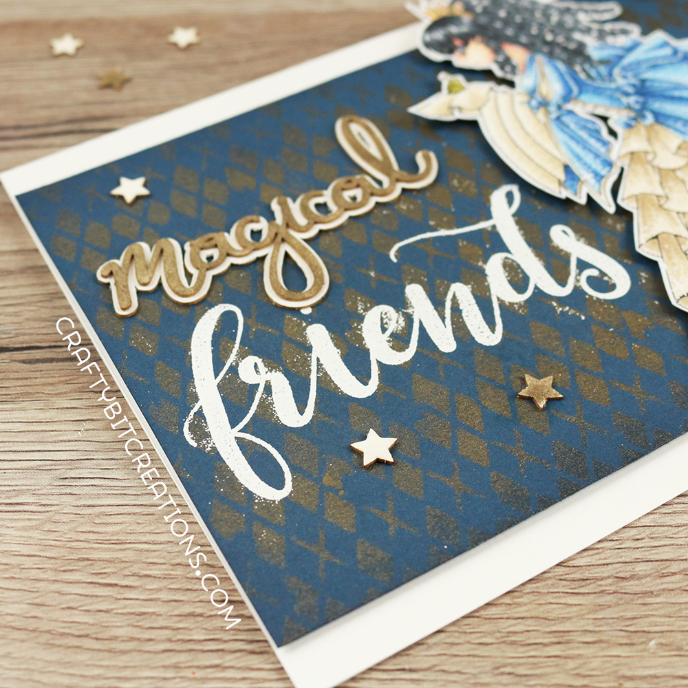 For the sentiment I used the Magical Layered Word, I coloured the bottom part with some white gesso and used the Perfect Pearls on the top part. To finish the sentiment I heat embossed the word Friends from the Create A Smile Stamps set called Friends Like You, with some Hero Arts Fine White Embossing Powder. To finish the card I added some Tinklings, half of them was coloured with the Perfect Pearls and the other half was coated with Nuvo Gloss Simply White.