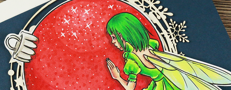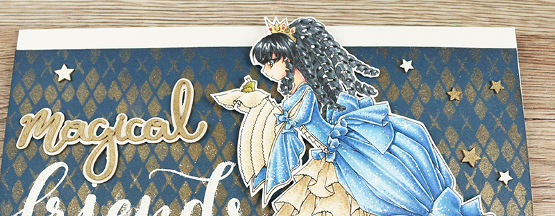 Todays card and videos (there is two) is all about those glittered effects, and gosh did I challenge myself with this one. I’ve tried colouring this image multiple times, never feeling that I make it justice, and then I added the challenge of glitter on top of that. It was super scary but also super satisfying! The glitter effect on the dress is created with metallic, glitter and white gel pens, you can see all how I coloured it below if you want to see it in HD you can do that HERE.