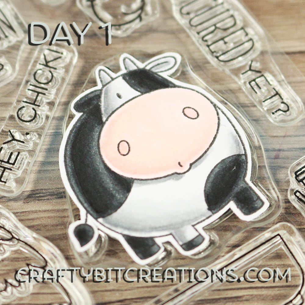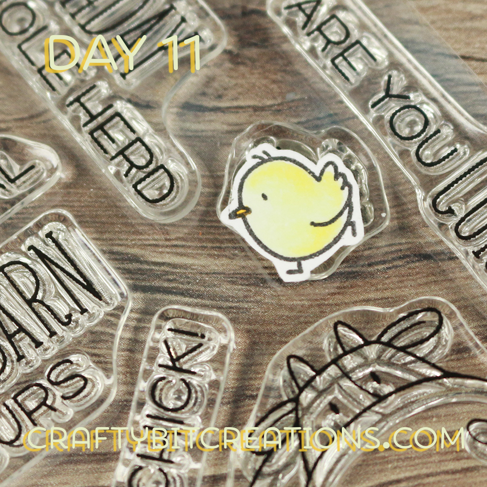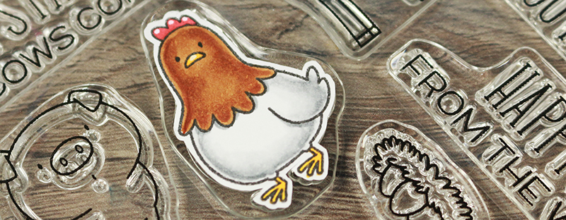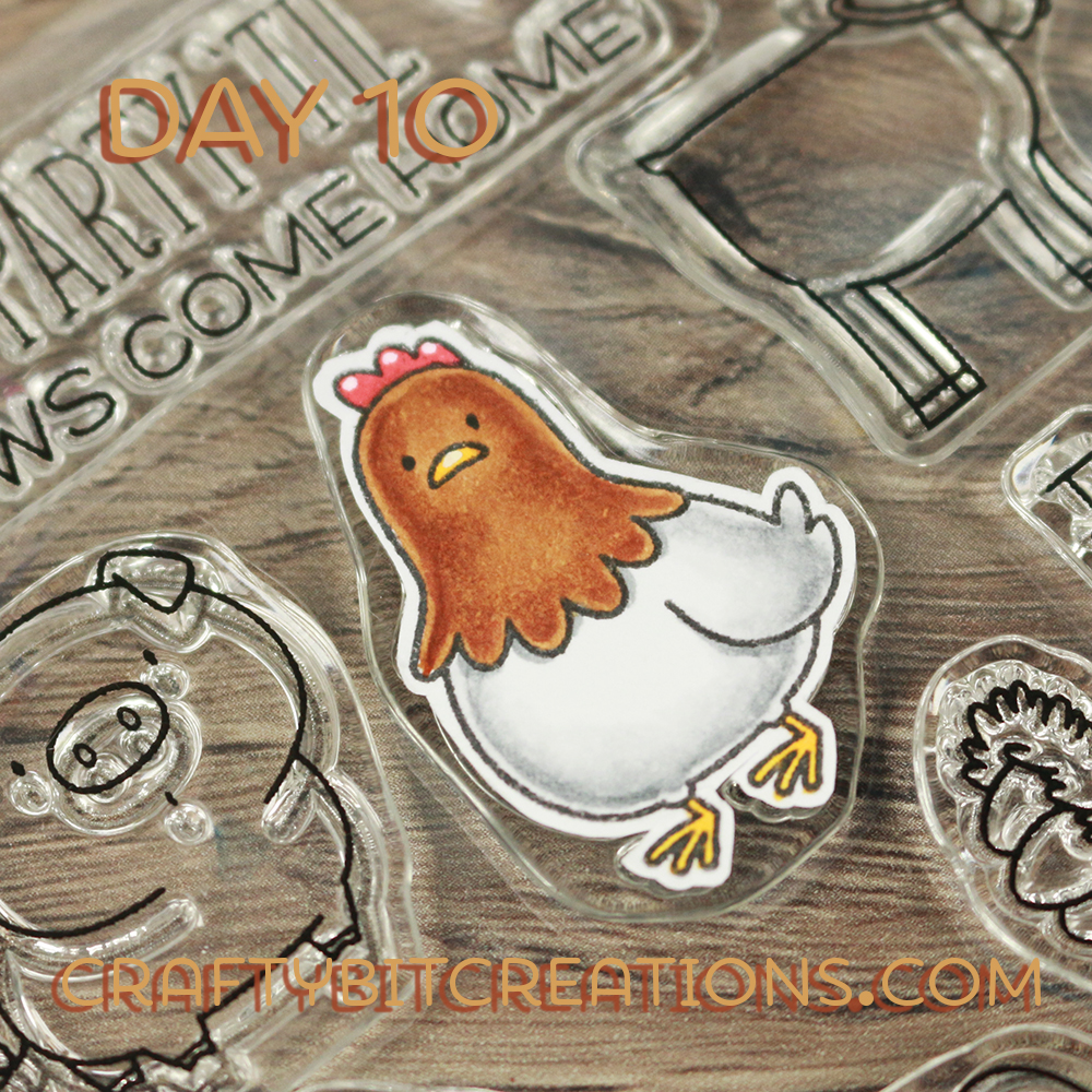 Day 10 already! 3 way through and today I have a smaller image, a cute little hen from the The Whole Herd stamp set by My Favorite Things. I made her brown and white and added a little shine to her comb and nose with a white gel pen.