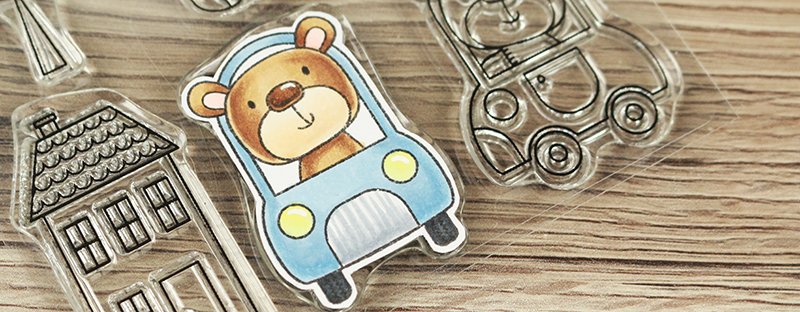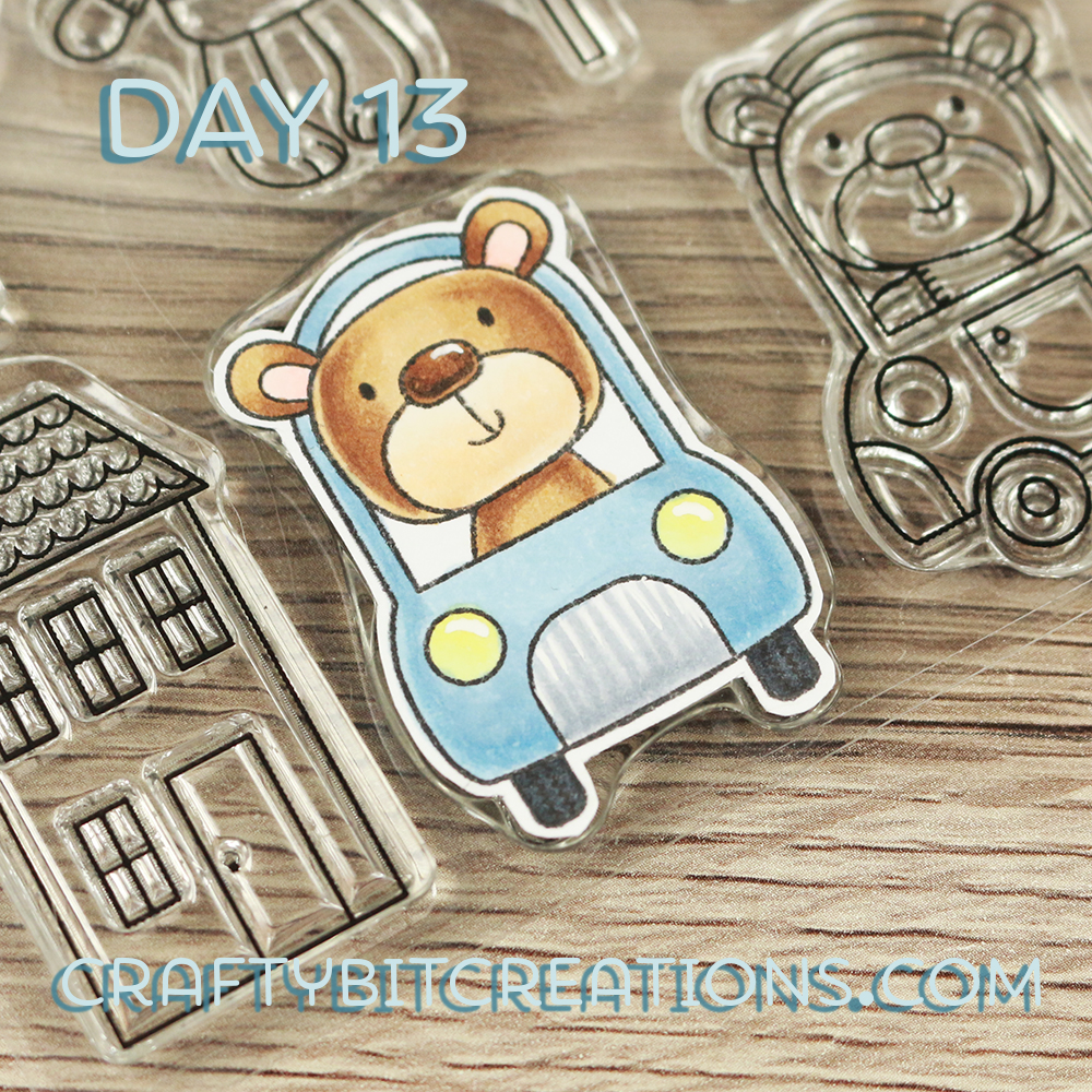I’m back with day 13 of the coloring challenge, today I’m coloring a driving bear from the Town Bear stamp set by My Favorite Things. Isn’t he adorable in his little blue car!