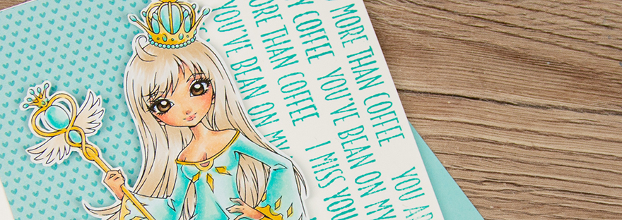 As I wanted to keep as much of the previous cards aesthetics I dug up a pattern paper that had the same pattering as from the previous card but in a different color (I was just very lucky that I found it). However when adding the character to the card I felt it left to much white space, but I fixed that by stamping my sentiments all over that side of the card and the card felt much more even. If you want to know more about that or see how I colored Venora you can look at the videos below.