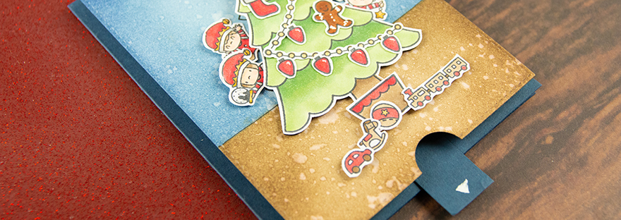 And now to the card! I had so much fun creating this card, figuring out how to make this work, when I got the idea I wasn’t sure that it would, but it did! As you can see on the photos this is a pull tab card, I call it a peekaboo card, as when you pull the tab, 5 little mini elves come peeking out behind the Christmas tree!