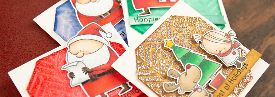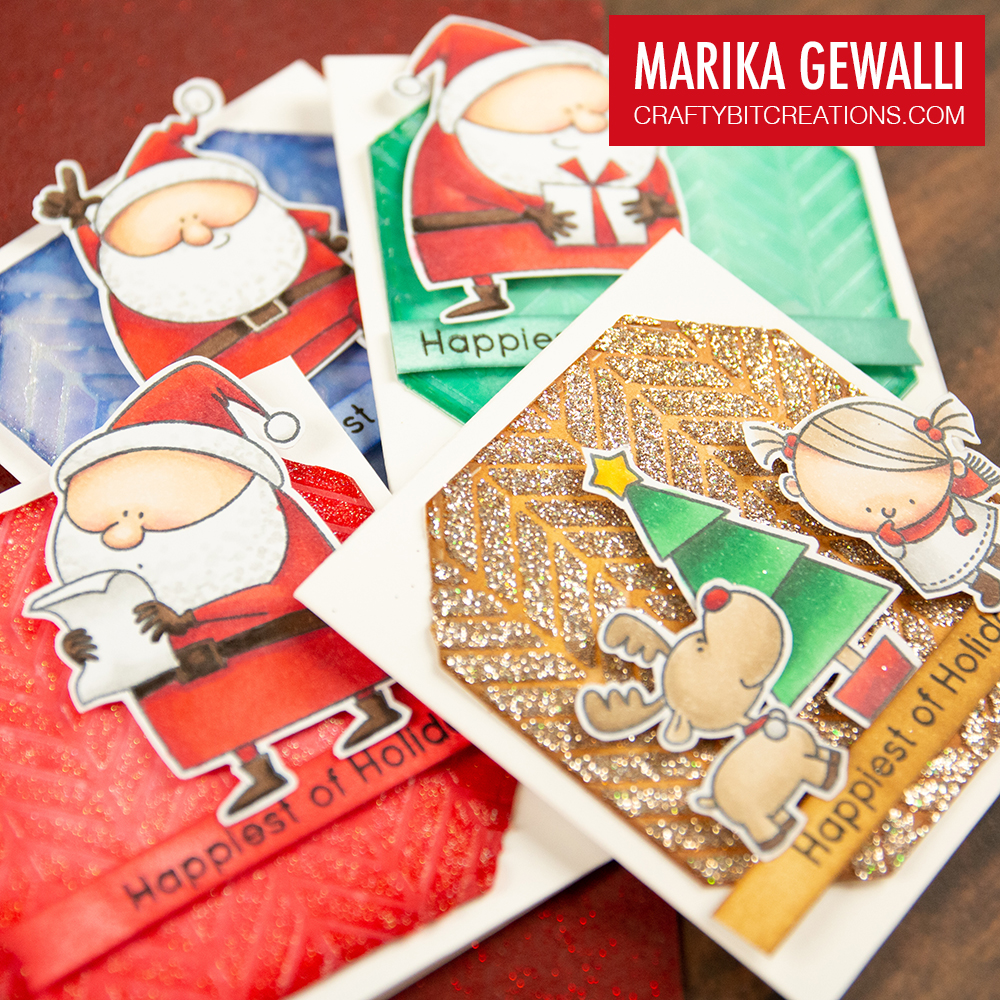For my cards today I’ve chosen to try different ways to add glitter, to make it pop a little better I’ve ink blended the background diets in different colors, using one lighter and one darker. I also choose to use the same stencil for all of the backgrounds to make the differences between the different techniques a little bit clearer. And to finish them off I’ve used some of the stamps I coloured up for the 30 day colouring challenge that is going on throughout November. If you wanna see the colouring of all of those images I will be sharing that in a couple of colouring videos coming up later in November/December.