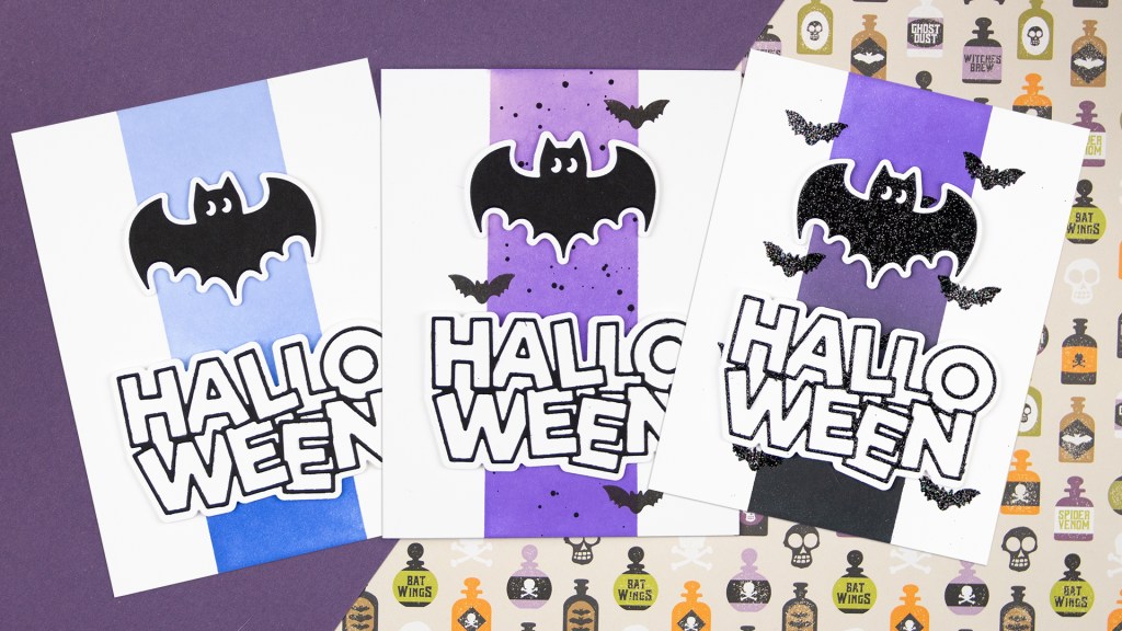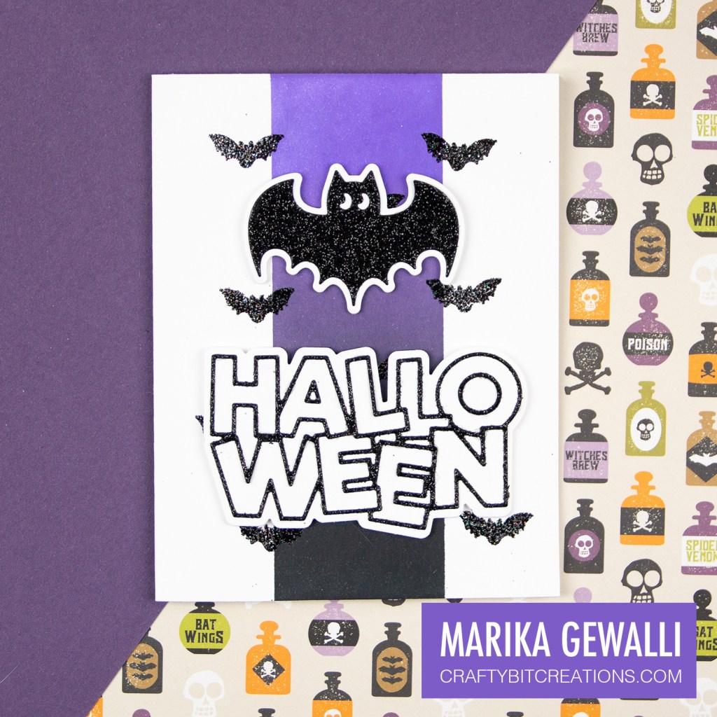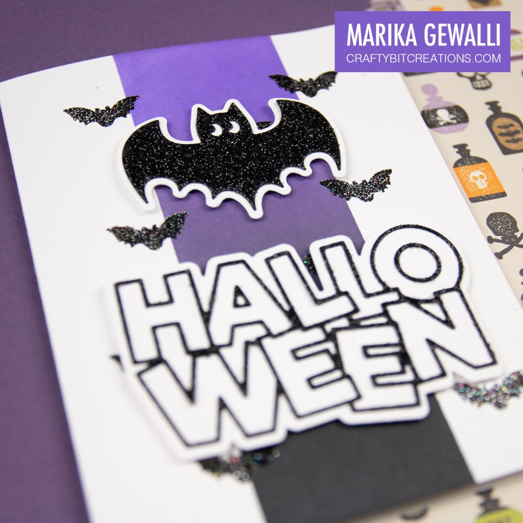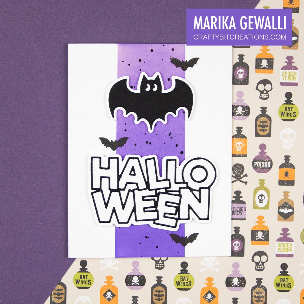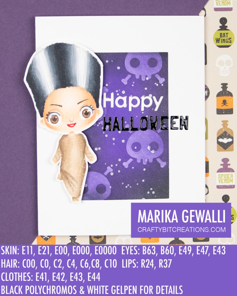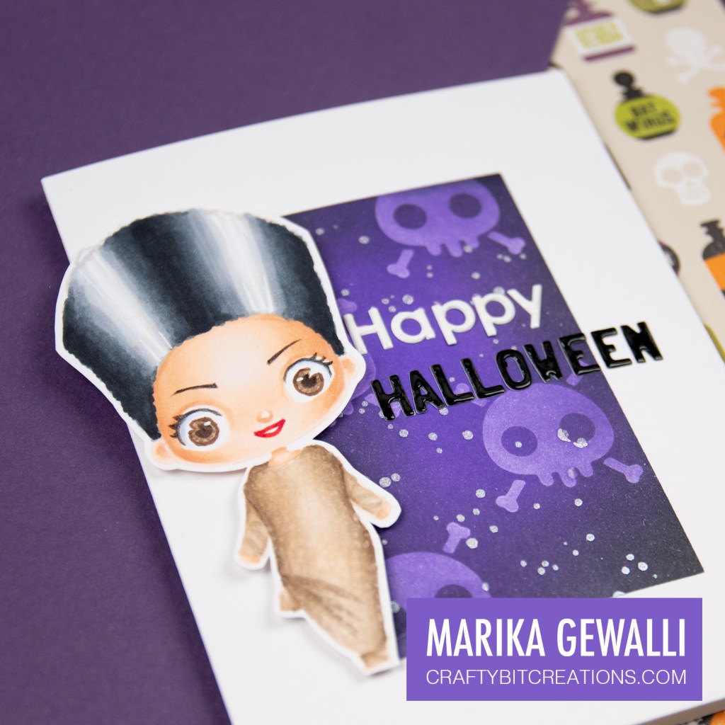 These 6 Mini Halloween cards all use the same color story, white and purple. I also use the coordinating cardstock and ink Grape Jelly by My Favorite Things, which really makes the cards come together. And for a final touch some of the images get flat layers of copic coloring for that little extra.