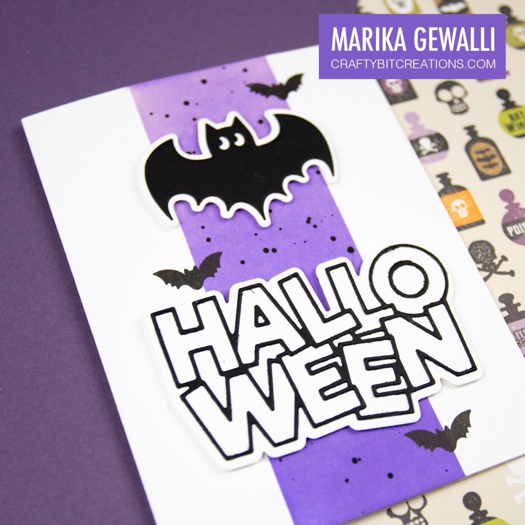 I knew I wanted to use the outline sentiments, and add just a little bit color. So I stamped the Spooky sentiment in some Memento Tuxedo Black Ink on some neenah cardstock. Then I picked out 6 purple markers and flatly colored each letter going from light to dark. Quick and simple.