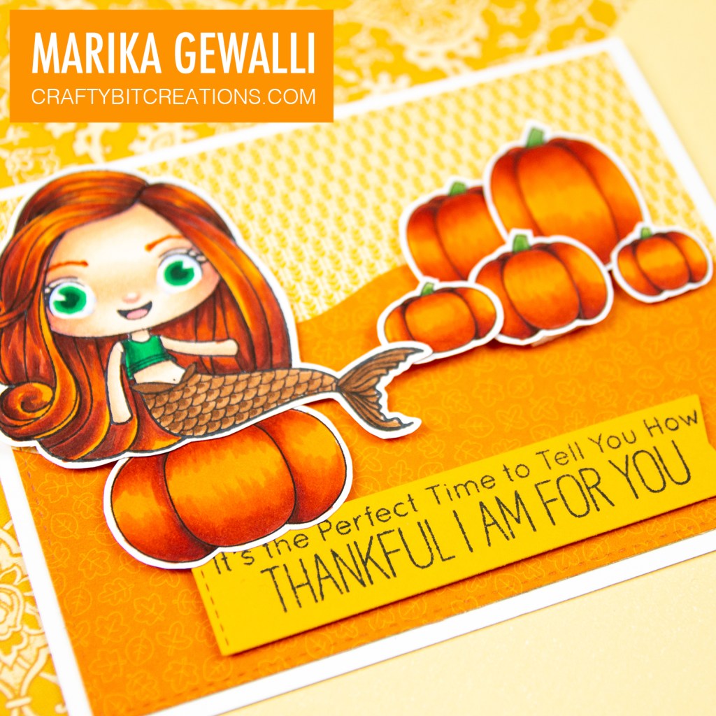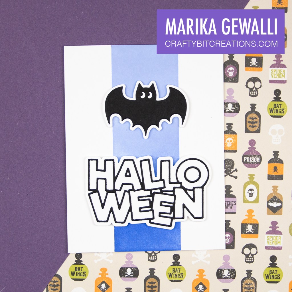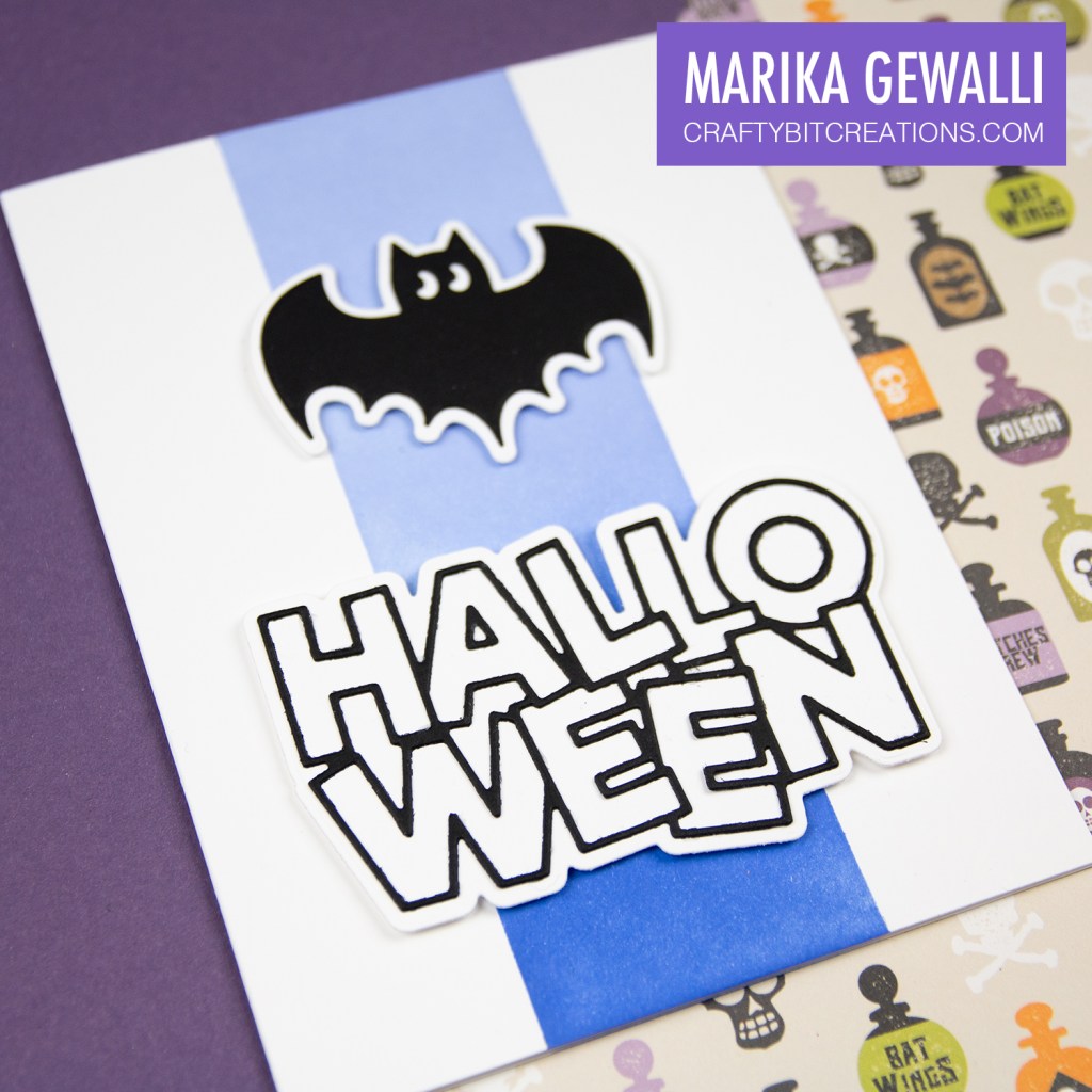 But I wasn’t finished with the Halloween outline stamp, I had another idea, very much inspired by my mummy card. I just stamped the sentiment in some coordinating ink on some coordinating cardstock, added a white outline with my colored pencil. And the card was done! Very quick and very simple.