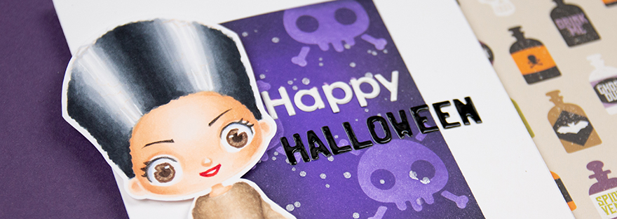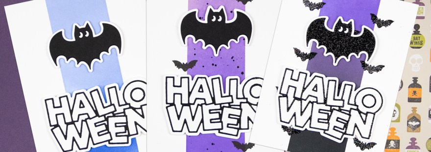 These 6 Mini Halloween cards all use the same color story, white and purple. I also use the coordinating cardstock and ink Grape Jelly by My Favorite Things, which really makes the cards come together. And for a final touch some of the images get flat layers of copic coloring for that little extra.