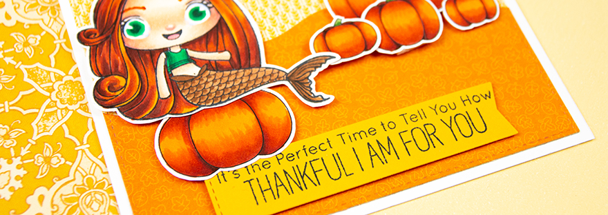 But I wasn’t finished with the Halloween outline stamp, I had another idea, very much inspired by my mummy card. I just stamped the sentiment in some coordinating ink on some coordinating cardstock, added a white outline with my colored pencil. And the card was done! Very quick and very simple.