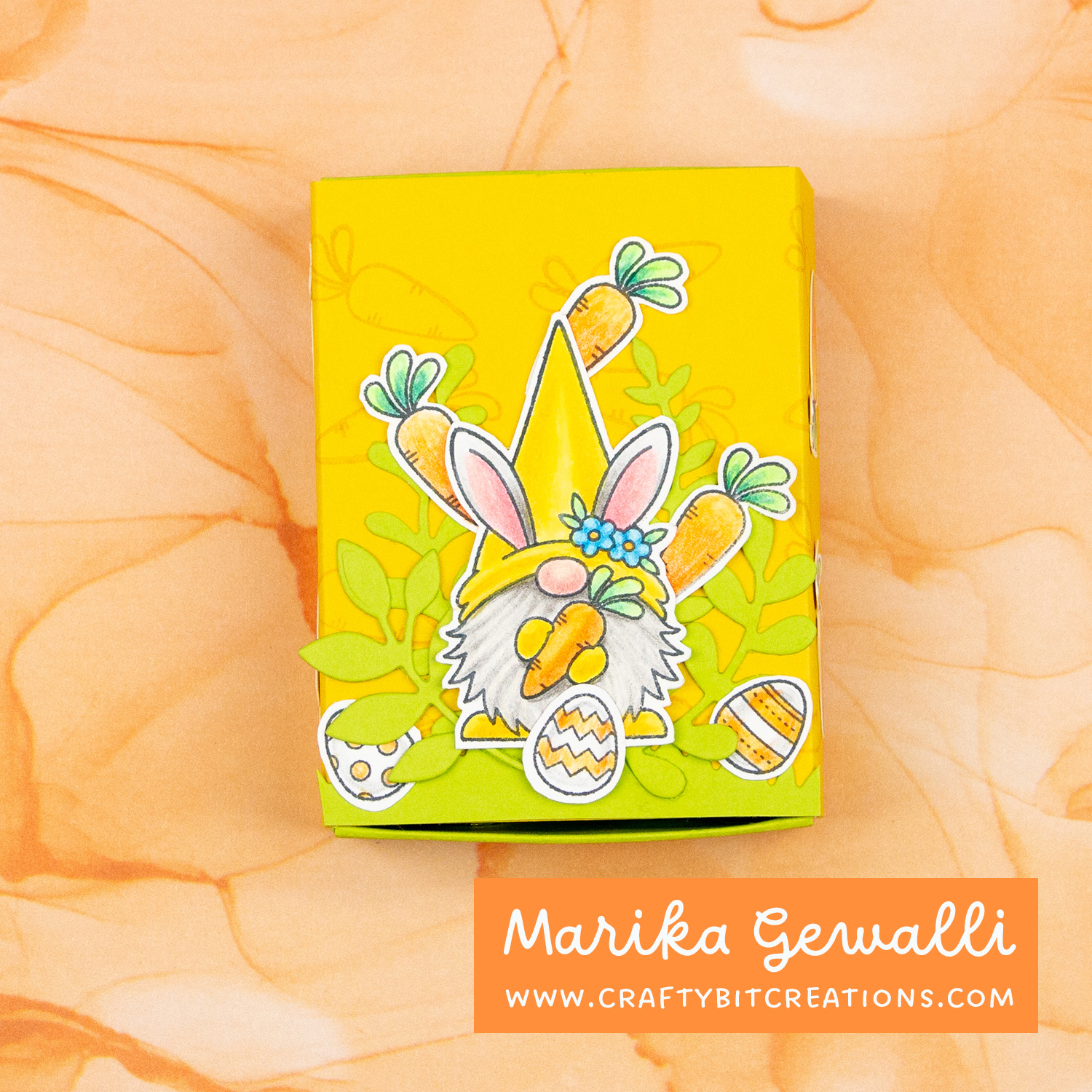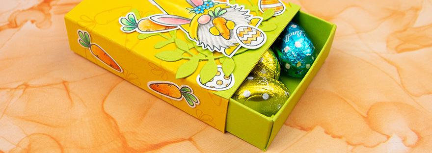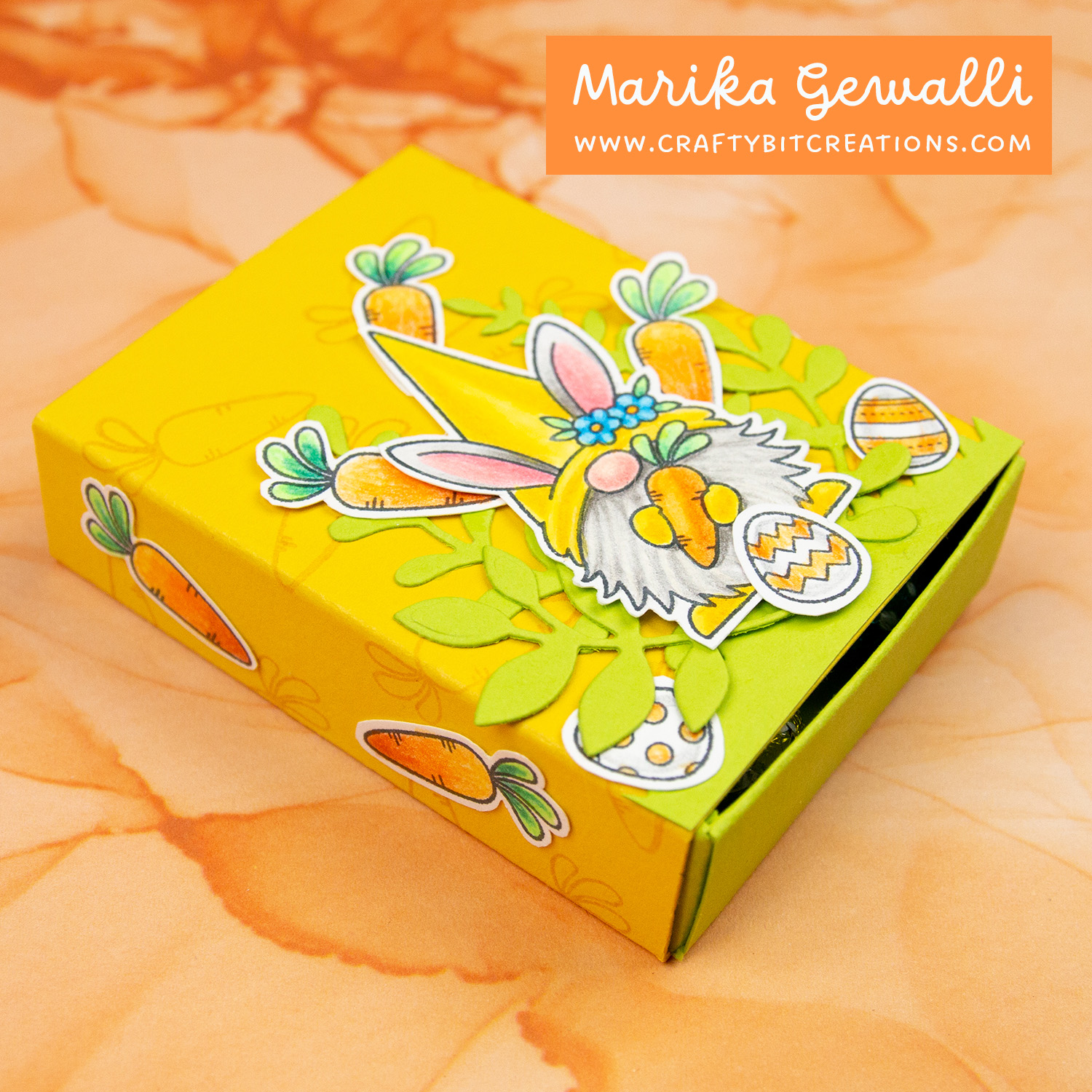 I started by coloring up a bunch of images from the Spring Gnome stamp set with my polychromos colored pencils. I think coloring is very soothing so I sat in front of the tv coloring away. I then cut the images out. For the box I use Lemon Drop Cardstock for the outer part and Limelight Cardstock for the drawer. To give the outside a little more interest I used the matching Lemon Drop Ink and stamped the cute little carrot all over it. After putting the box together I decorated it with my colored images and some diecuts from the Fab Foliage Die-namics.