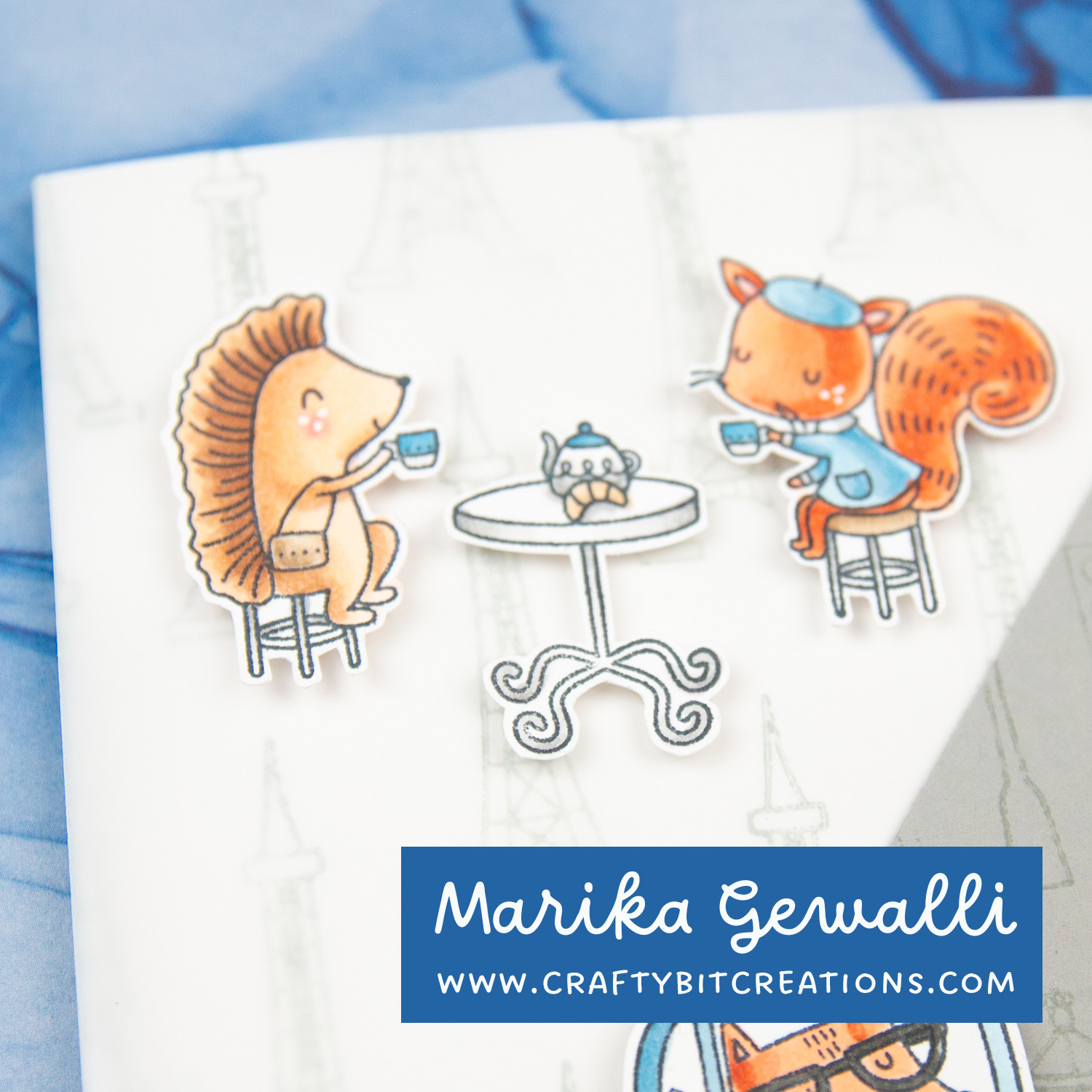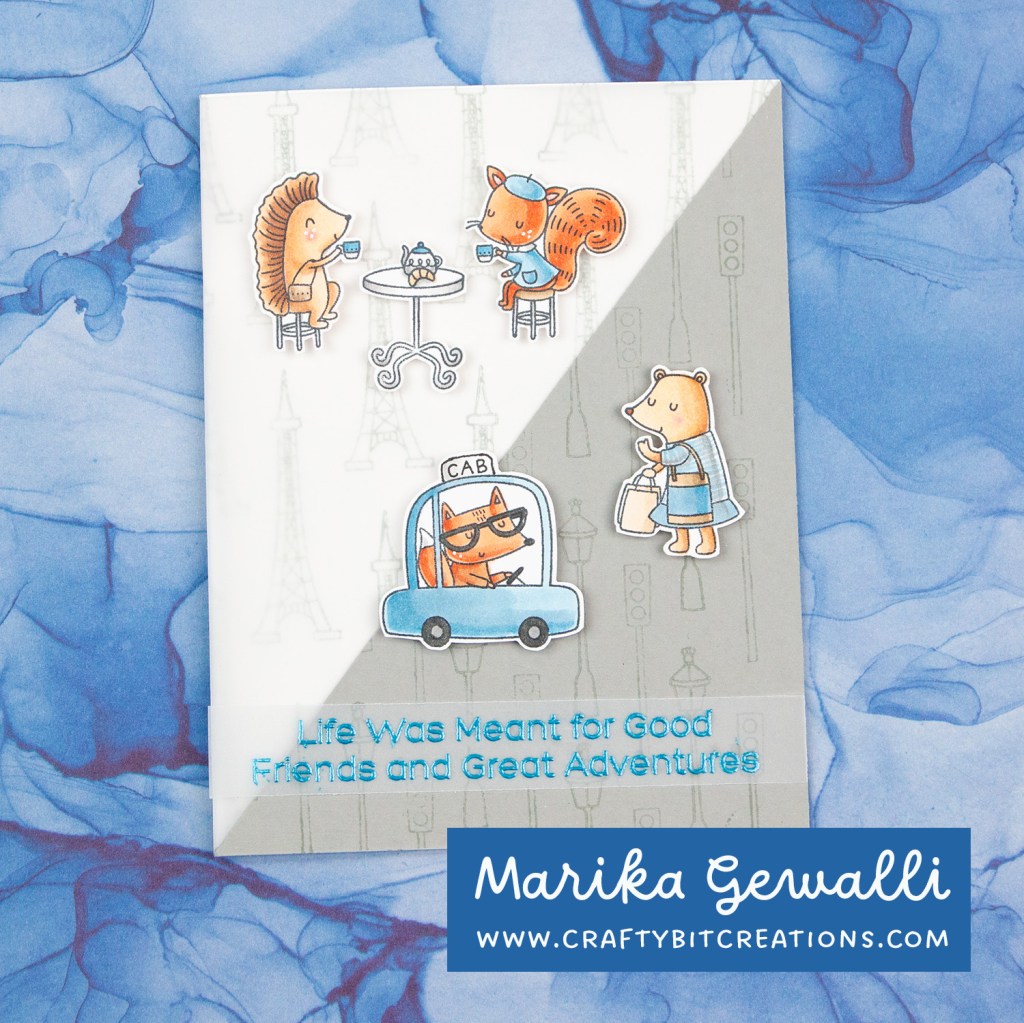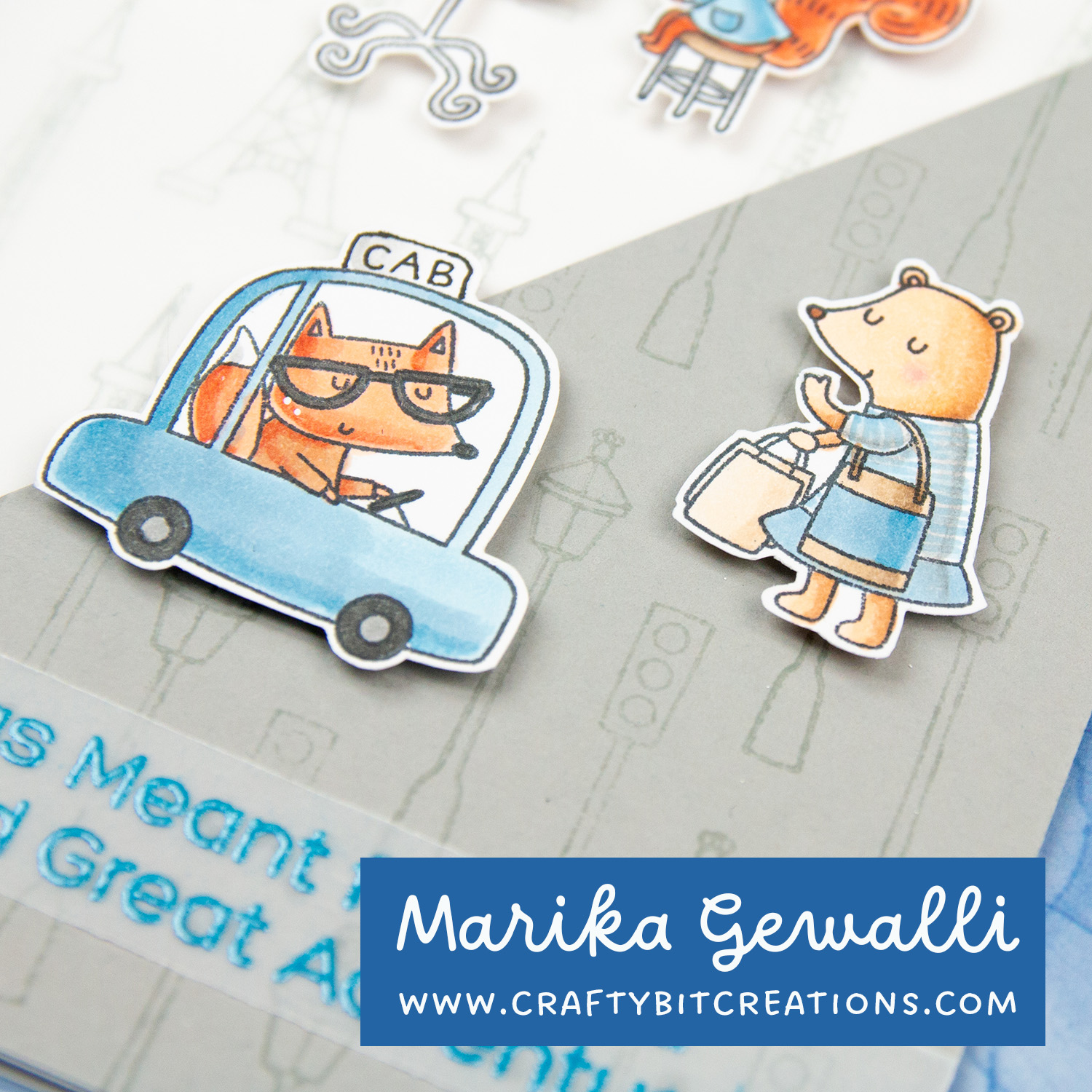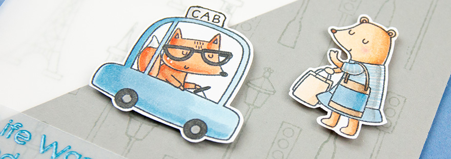 I did a couple of modification to the stamp set to make it fit into my story a little bit better. The little car got a cab sign. And the shopping bear lost what I think is a credit card (or money) so it would look like she was waving the car down. For the background I used cement cardstock and ink. But the ink I did stamp of on a separate paper to make it a little bit lighter. In the end I felt that the eiffel towers still was a little to dominant so I added some vellum to lighten them a little bit more. And lastly I uses some vellum and some blue embossing powder for the sentiment. Hope you enjoy the card!