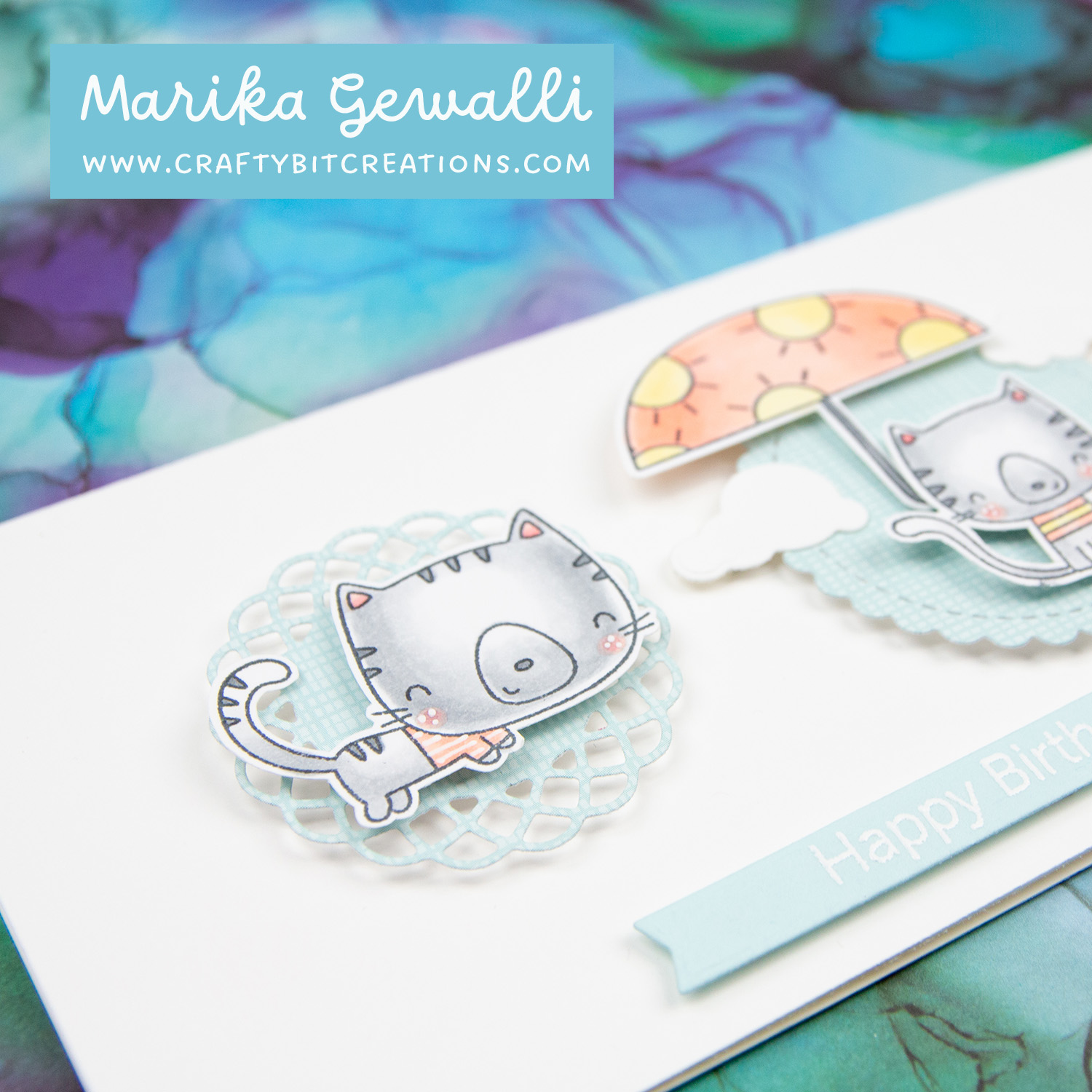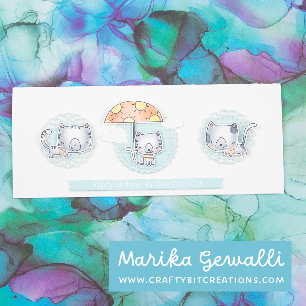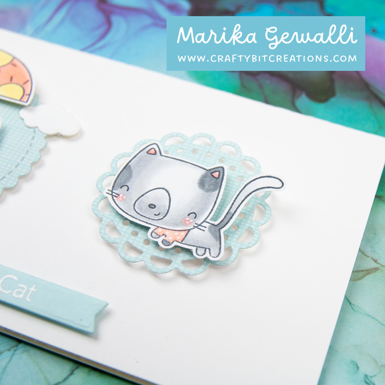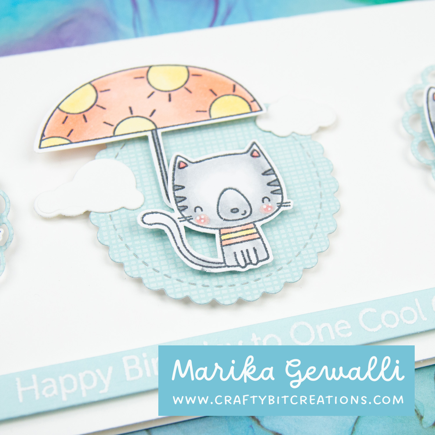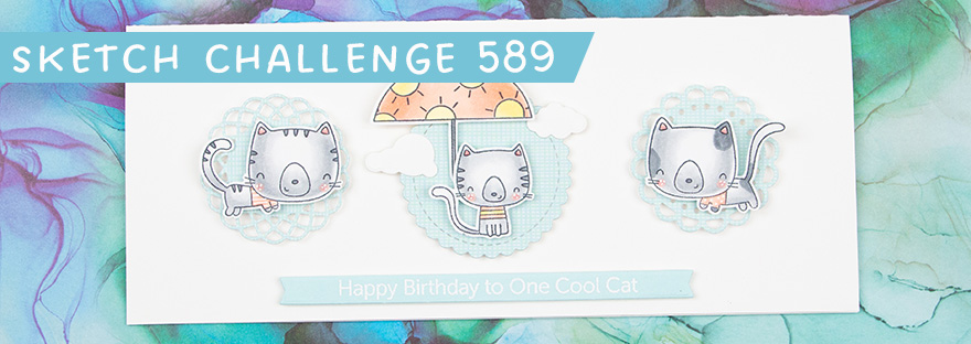 The straight facing cat is a little small though, so I also stamped up the umbrella to give the center piece a little bit more. I did mask in the sun from the stamp set on the umbrella to give that some more details. To finish of the center piece I added some clouds from the Cloudy with a Chance of Rain Die-namics that was the free with $60 in this months release. For the sentiment I went with “Happy Birthday to one Cool Cat” which I white heat embossed onto some Sno Cone cardstock and cut it out with a flag die from the Blueprints 27 Die-namics. If you want to see the other challenges that I have joined you can find them HERE.
