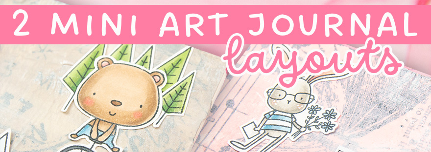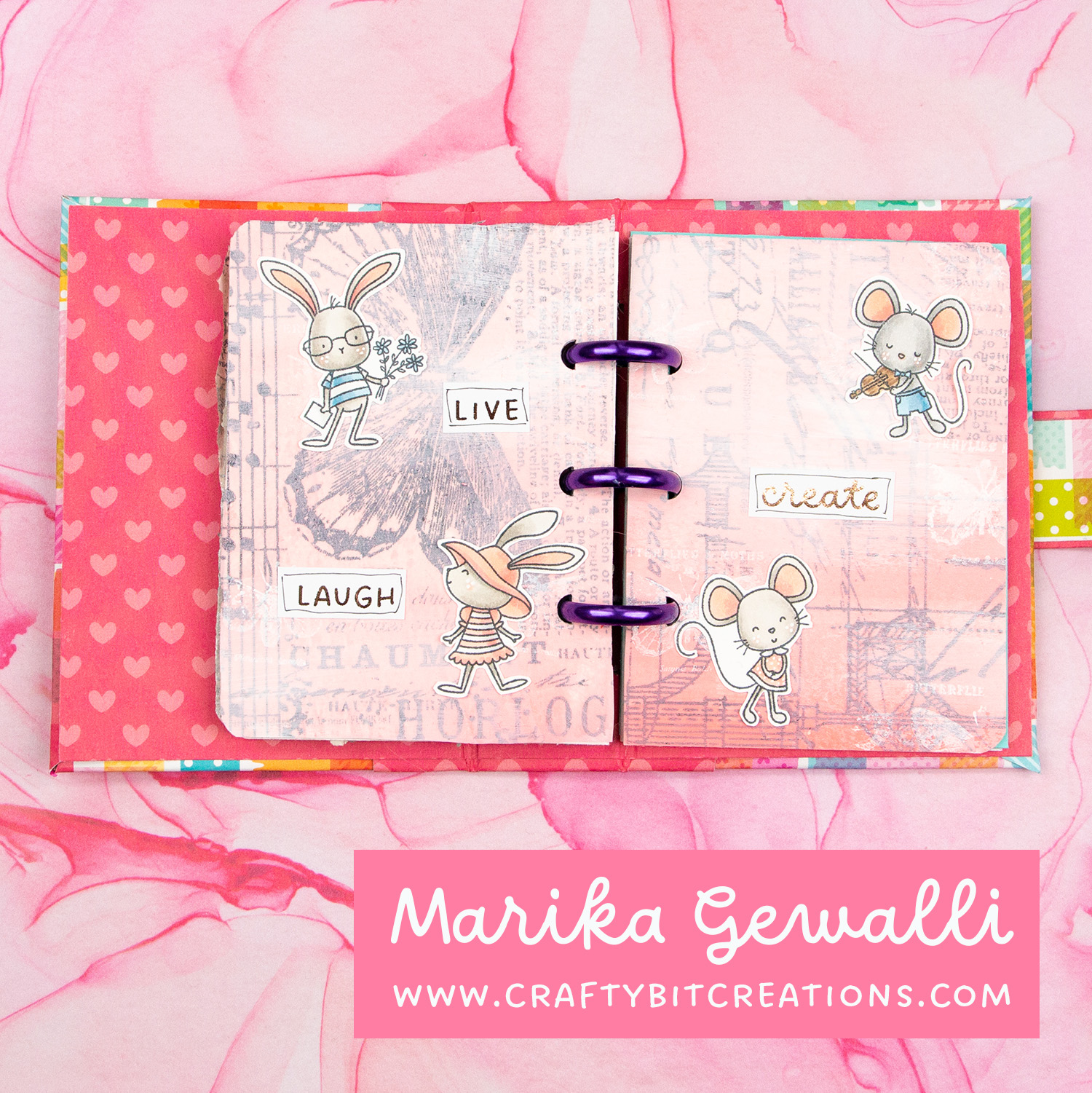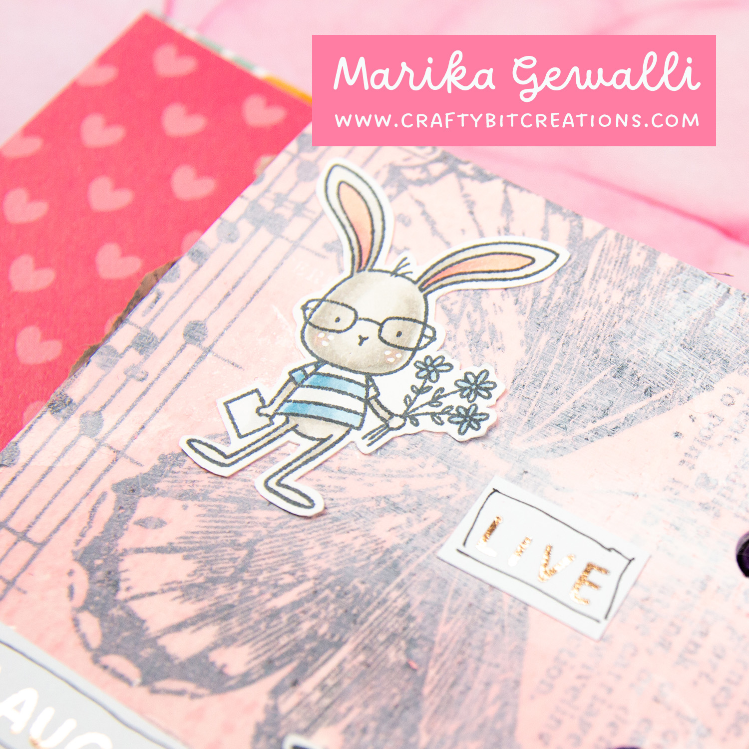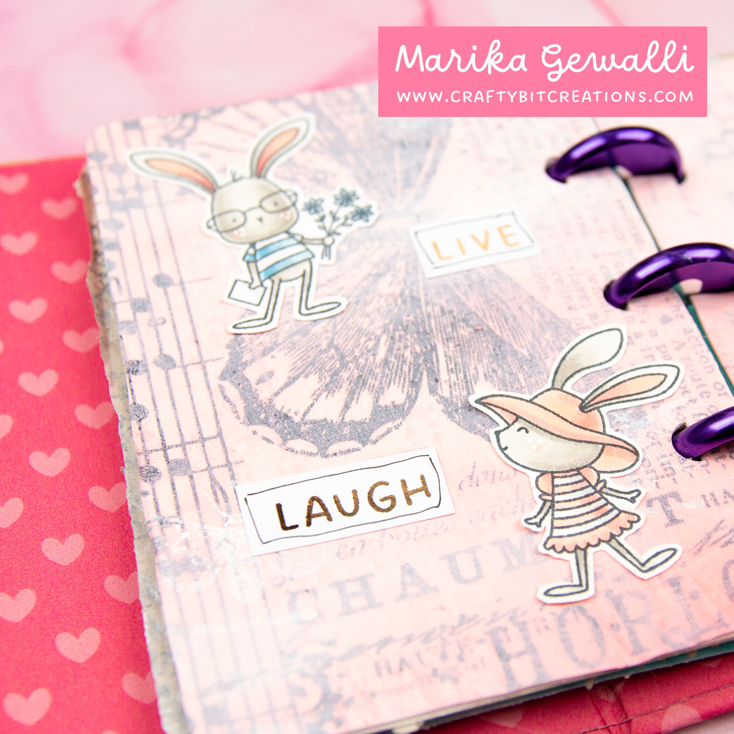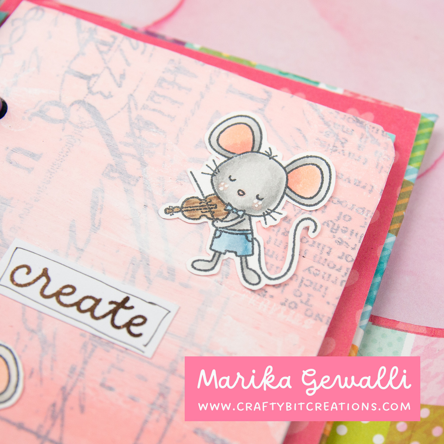 For my second layout I started with the sentiment “Love, Laugh, Create” from my own Sentiment Strip cards (which you can buy from HERE) and decided to use the violin playing mouse. I did also add the bunnies from the same stamp set to fill out the place. For color I used abandoned coral paint mixed with some white gesso to mimic tattered rose, and I painted that over the “Melange” tissue paper that I had. If you want to see more art journal layouts I have made you can find all of them HERE