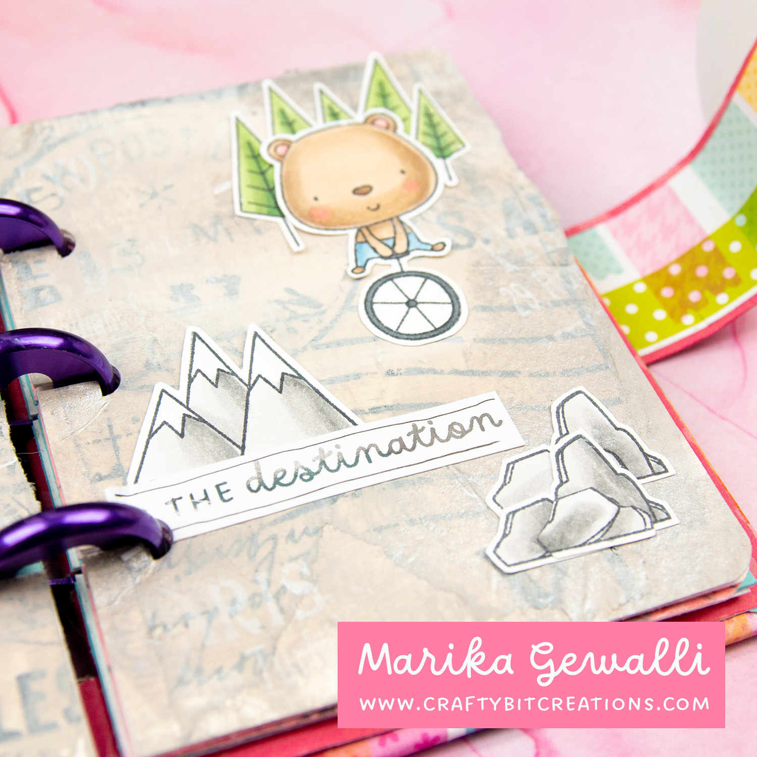 I love the little stones and mountains (that comes from a recently retired stamp set) so the first layout got a pumice stone background together with a postage tissue paper as the idea was travel. I did add a circus artist as he was on a unibike, but I did cut off his hat to make it look more travel related.