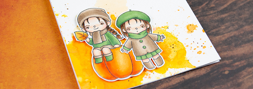 I’ve chosen to add my blob of color (and my little focal images) in the bottom left corner, using the rule of thirds technique placing them on the lower left intersection, as it will give good balance and a little bit of air around the characters. I also used the color and small splatters to pull the eye towards the end of the card.