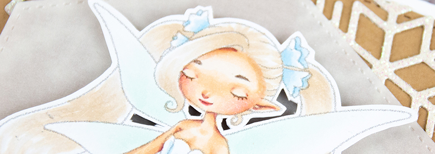 As with many of my cards, it’s simple and created to showcase the stamp more than anything. It’s an A2 card base, with a stitched rectangle out of latte cardstock. I cut out the snowflakes and the sentiment out of some white glitter cardstock and filled up the background. To make the fairy stand out a little bit extra I cut out a stitched hexagon in some vellum to put behind the fairy.